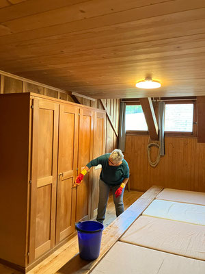 Von Holz abladen, Küche streichen, über ALLE Fenster putzen, Spiele aufräumen, Brunnstube und Reservoir putzen, Staub und Spinnhubele saugen, Schlüsselbrett neu gestalten, Bilder aufhängen bis Abend- und Morgenstimmung geniessen! Dazu haben wir bei feinem Essen auch über die Zukunft der Hütte diskutiert und wie wichtig es ist, dass wir noch mehr Leute gewinnen, die Mitanpacken, mitdenken und mitgestalten!